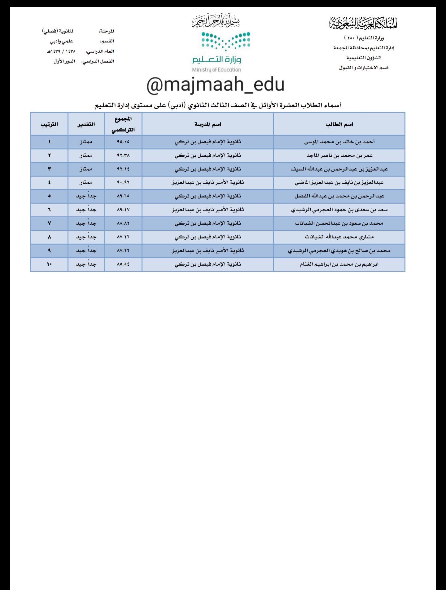 المجمعة الآن Di Twitter أسماء الطلاب العشرة الأوائل على مستوى مدارس العيال في المرحلة الثانوية في محافظة المجمعة