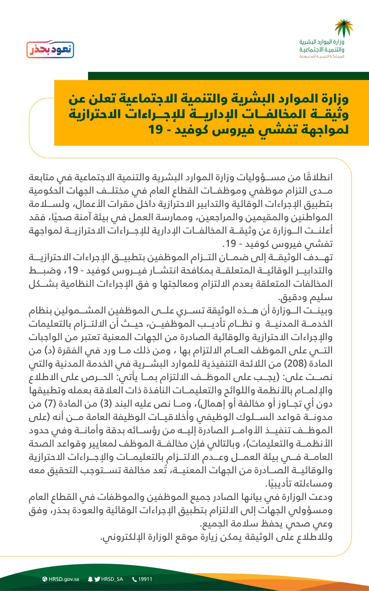 وزارة الموارد البشرية والتنمية الاجتماعية Auf Twitter وزارة الموارد البشرية والتنمية الاجتماعية تعلن عن وثيقة المخالفات الإدارية للإجراءات الاحترازية لمواجهة تفشي فيروس كوفيد 19 نعود بحذر Https T Co Kc9pzawed5 Https T Co Zuzszj1hxj