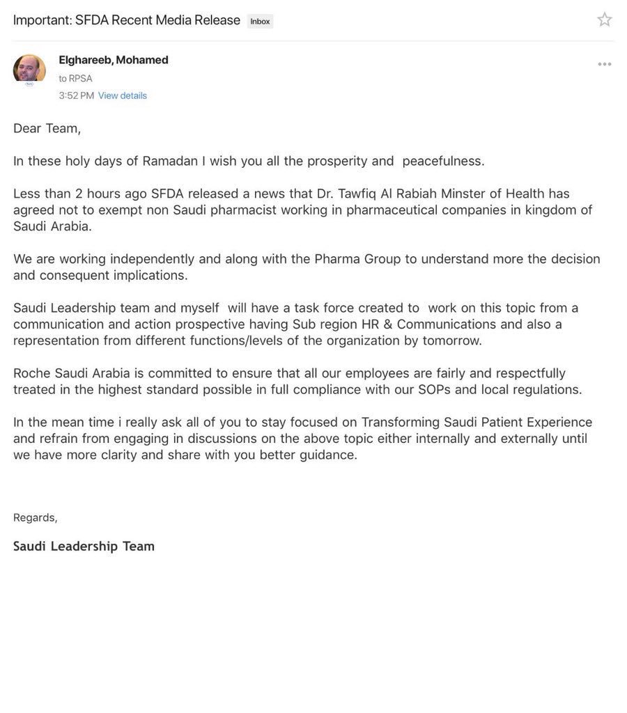 عطالة الصيادلة Twitter પર شركات الادوية ترفض التوطين ايميلات متداولة لمدراء شركات الادوية في السعودية تطمن موظفيها الاجانب ببقاء وظائفهم وسعيهم للتلاعب على قرار هيئة الغذاء و الدواء بتوطين مهنة الدعاية الطبية Https T Co Xnqmxvkjah