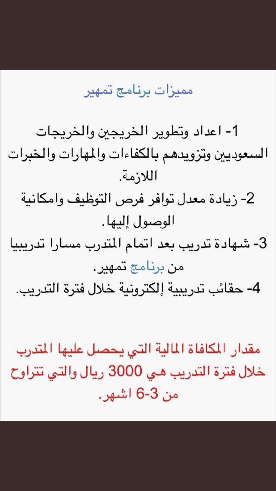 للخريجين والخريجات برنامج تمهير يقدم لك تدريب ا بـ3 آلاف شهري ا
