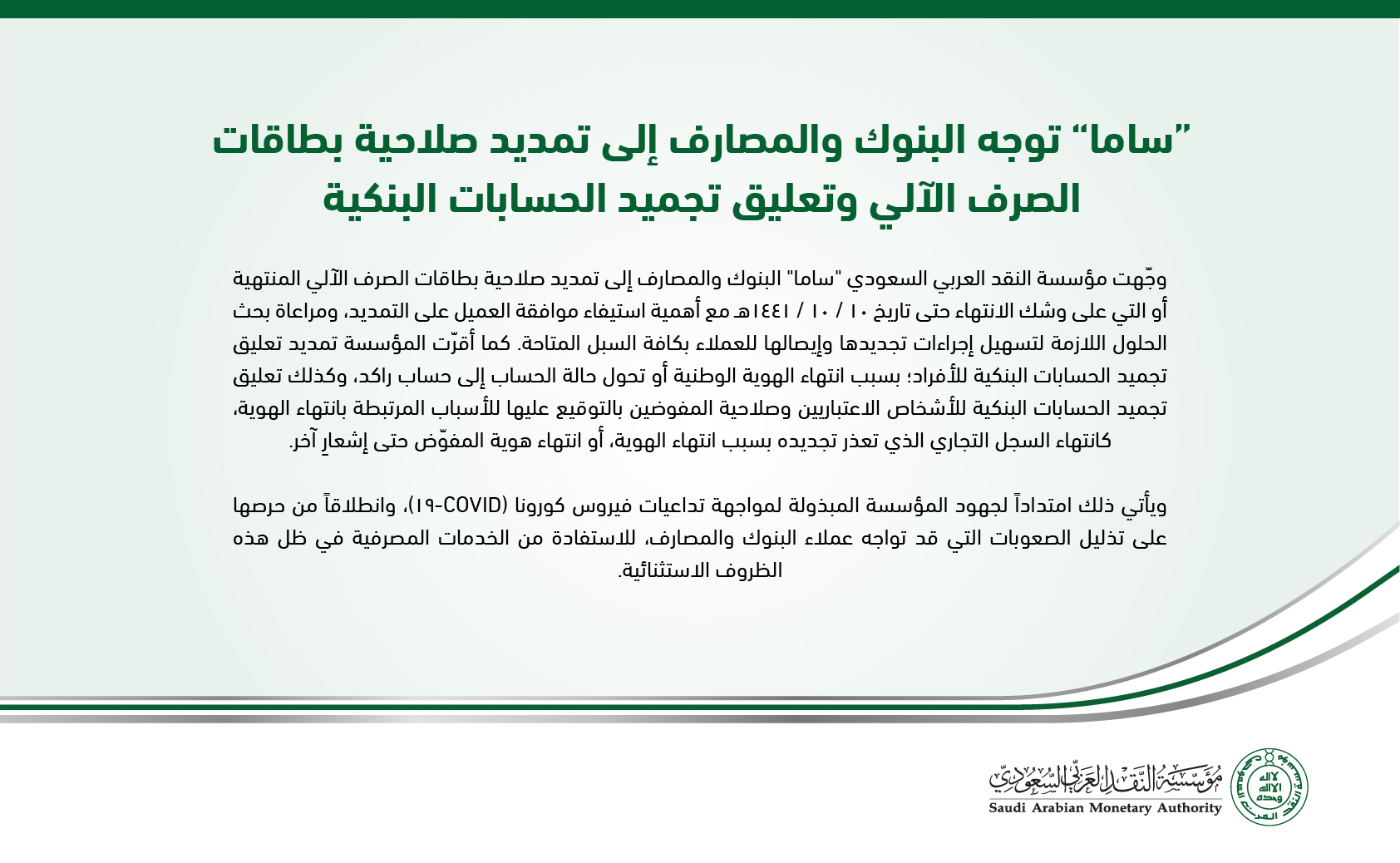 Sama مؤسسة النقد العربي السعودي On Twitter ساما توجه البنوك والمصارف إلى تمديد صلاحية بطاقات الصرف الآلي وتعليق تجميد الحسابات البنكية Https T Co Ijviiztvd0 مؤسسة النقد Sama كلنا مسؤول Https T Co Hdgpyepqks