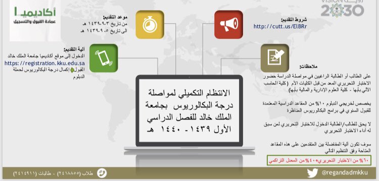 عمادة القبول والتسجيل Twitterren تعلن عمادة القبول والتسجيل جامعة الملك خالد عن موعد التسجيل بالنظام التكميلي لخريجين كليات المجتمع