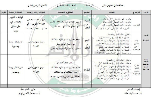 خطة تحليل محتوى رياضيات للصف الثالث الفصل الثاني المعلم الفلسطيني