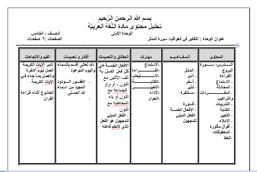 نموذج Word الخطة الفصلية تحليل المحتوى لمادة اللغة العربية الصف الخامس الفصل الاول منتديات صقر الجنوب